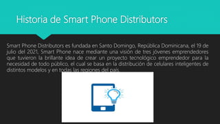 Smart Phone Distributors es una empresa fundada en Santo Domingo en 2021 por tres jóvenes emprendedores, dedicada a la distribución de celulares inteligentes y accesorios. Su misión es ofrecer dispositivos móviles con garantía y precios accesibles, mientras que su visión es ser líderes en ventas a nivel nacional e internacional. La empresa se enfoca en satisfacer a sus clientes a través de un servicio de calidad, promociones y la exclusividad de equipos recién lanzados al mercado.