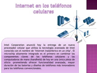 El documento describe la evolución de la tecnología de procesadores celulares y el desarrollo de la conectividad inalámbrica. Intel anunció un nuevo procesador celular que integra los componentes clave de teléfonos y computadoras en un solo chip, prometiendo mayor funcionalidad, duración de batería y diseños innovadores. También se discute el crecimiento del acceso a Internet a través de teléfonos celulares y la popularidad de las compras móviles.
