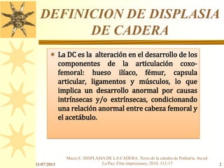 La displasia congénita de cadera (DC) es una alteración en el desarrollo de la articulación coxo-femoral que implica una relación anormal entre la cabeza femoral y el acetábulo. No presenta signos ni síntomas al nacer, pero con el tiempo puede manifestarse como cojera, marcha de pato u otras anomalías. Su diagnóstico incluye maniobras como la de Barlow y Ortolani, así como estudios radiográficos. Su tratamiento depende de la edad y gravedad, pudiendo incluir arnés de Pav