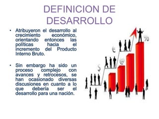 El documento define el desarrollo sostenible como aquel que satisface las necesidades del presente sin comprometer la capacidad de las futuras generaciones para satisfacer sus propias necesidades. Explica la evolución de la teoría del desarrollo desde los años 1950 hasta los 1990 y los autores destacados en cada período. Finalmente, destaca la importancia de las libertades fundamentales y el desarrollo integral del individuo según Amartya Sen.