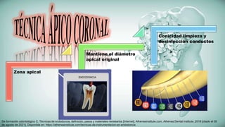 Los documentos tratan técnicas de preparación biomecánica de conductos radiculares. Detallan métodos como la técnica escalonada, que mantiene el diámetro apical original mediante instrumentación secuencial con limas de calibres crecientes. También describen la importancia de la irrigación y cómo técnicas como la "en llama" son útiles para conductos finos o curvos. El objetivo final es limpiar y dar forma cónica al conducto de forma segura y efectiva.