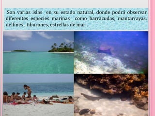 Este documento describe varias islas en los Cayos Holandeses de Panamá, incluyendo la Isla Morodup, la más grande Isla Galubir, y los Cayos Limones formados por más de 20 islas. También describe las islas Diablo e Isla Corazón de Jesús, conocida por los indígenas como Akuanusadup, que alberga una población de 600 personas y es conocida por su "Piedra Mágica".