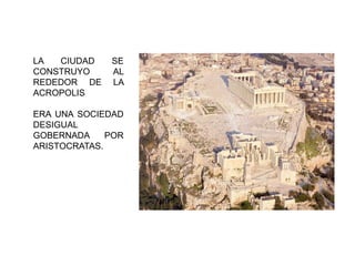 Atenas se construyó alrededor de la Acrópolis y era una sociedad desigual gobernada por aristócratas. Más tarde, Clístenes estableció la democracia ateniense en el 508 a.C., dando a todos los ciudadanos el derecho a votar y participar en la asamblea. Bajo Pericles en el siglo V a.C., Atenas alcanzó su edad de oro con logros culturales como la construcción del Partenón.