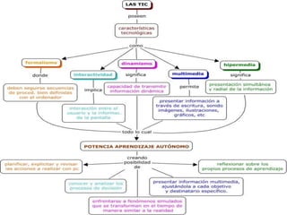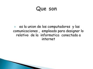 Las TICS son la unión de computadores y comunicaciones relacionadas con Internet. Son innovadoras y creativas, y benefician principalmente el área educativa al hacerla más accesible y dinámica. Aunque aumentan la producción y difusión de tecnología, también plantean riesgos como falta de privacidad, aislamiento y fraude.