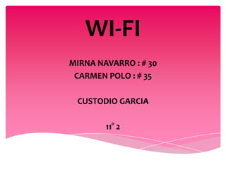 El documento habla sobre Wi-Fi, una tecnología inalámbrica que permite la conexión de dispositivos electrónicos a Internet a través de un punto de acceso. Explica que Wi-Fi surgió en los años 90 aunque de forma desordenada, y que la primera norma establecida fue 802.11b en 2000. También describe los dispositivos involucrados como puntos de acceso, tarjetas de red y routers, así como las ventajas de conectividad sin cables y desventajas como limitaciones de distancia y seguridad.