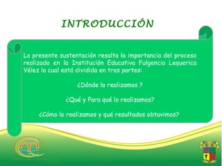 El documento resume el proceso realizado en la Institución Educativa Fulgencio Lequerica Vélez. Se divide en tres partes: la ubicación y reseña histórica de la institución, los objetivos y actividades desarrolladas como potencializar al sujeto y mejorar el contexto a través de la interacción, y los resultados obtenidos aplicando esta metodología de desarrollo comunitario.