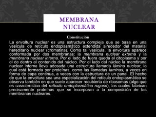 La membrana nuclear está compuesta de dos membranas, la externa y la interna, que envuelven el núcleo. La membrana interna está recubierta por la lámina nuclear, formada por proteínas como las laminas. Ambas membranas contienen poros que permiten el paso de moléculas entre el núcleo y el citoplasma. La membrana externa está unida al retículo endoplasmático, mientras que la interna contiene la cromatina compuesta por ADN y proteínas.