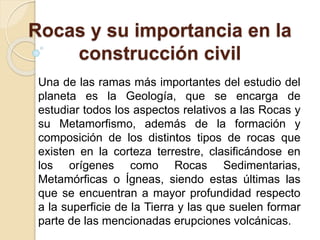 Este documento describe los tipos principales de rocas y su importancia para la construcción civil. Explica que hay rocas ígneas, metamórficas y sedimentarias, y que las rocas se utilizan ampliamente en la construcción de infraestructura en Nicaragua debido a sus propiedades mecánicas y ubicaciones de los yacimientos.