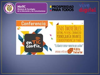 El documento describe las ventajas de las tecnologías de la información y la comunicación (TIC) en el ámbito educativo tanto para estudiantes como docentes. También analiza el ranking de Colombia en el uso de TIC a nivel mundial y las iniciativas que está implementando el Ministerio de TIC en el país.