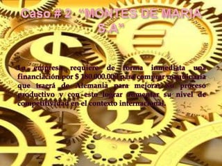 El documento presenta varias opciones de inversión y financiación para la empresa "DE FRENTE AL TLC" con US$50.000. Se analizan CDTs, cuentas de ahorros, créditos de consumo e inversiones empresariales en Bancolombia. La mejor alternativa es un CDT a un año, que ofrece la mayor rentabilidad.