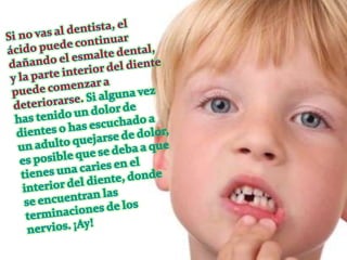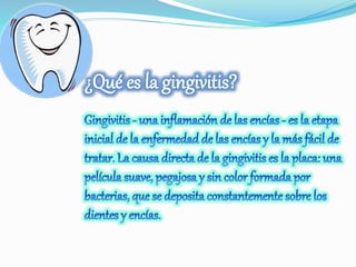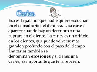 Una caries es un orificio en los dientes causado por el deterioro o ruptura del esmalte dental debido a la acumulación de placa y alimentos. Para prevenir las caries y la gingivitis, es importante cepillarse los dientes correctamente, usar hilo dental, comer una dieta balanceada, dejar de fumar, y visitar regularmente al dentista.
