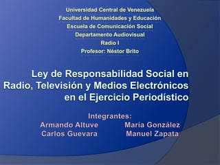 La ley establece principios como la libre expresión y prohibición de censura para los medios de comunicación. También busca garantizar el acceso a información veraz mientras protege derechos como la intimidad y reputación. La ley regula el contenido permitido en medios para proteger a audiencias vulnerables y el orden público. Además, faculta a la comisión nacional de telecomunicaciones a monitorear el cumplimiento de la ley y aplicar sanciones a emisoras que violen la normativa.