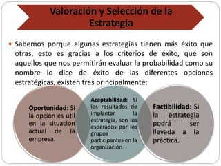 Este documento describe los pasos clave para seleccionar con éxito una estrategia. Primero, se debe definir claramente el concepto de estrategia y en qué nivel organizacional se aplicará. Luego, el grupo estratégico debe desarrollar un pensamiento estratégico efectivo. Finalmente, la estrategia se selecciona mediante un análisis de oportunidad, aceptabilidad y factibilidad basado en criterios como flujo de efectivo y recursos disponibles.