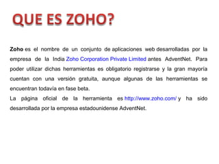 Este documento resume las principales aplicaciones web desarrolladas por Zoho Corporation, incluyendo un procesador de texto, hoja de cálculo, editor de presentaciones, editor de wikis, aplicaciones de conferencias web, creador de aplicaciones, organizador personal y chat. La mayoría de las herramientas de Zoho son gratuitas y ofrecen almacenamiento ilimitado.
