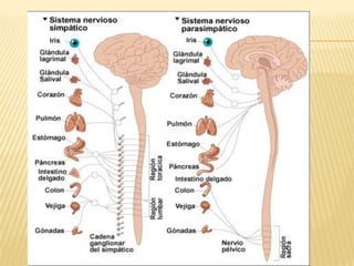 El documento describe la regulación nerviosa de la circulación y el control rápido de la presión arterial. Explica el papel del sistema nervioso autónomo simpático y parasimpático en el control de la circulación, así como los centros vasomotores del cerebro y los mecanismos reflejos que mantienen la presión arterial, como los barorreceptores. También cubre conceptos como el gasto cardíaco, la resistencia periférica y el ciclo cardíaco.