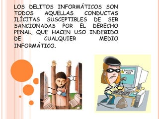 Este documento clasifica y describe los delitos informáticos según el instrumento o medio utilizado, el fin u objetivo perseguido, y las actividades delictivas graves. Explica que los delitos informáticos incluyen falsificación de documentos, robo de información confidencial, modificación de datos, uso no autorizado de programas, y actividades como terrorismo y espionaje industrial. También resume brevemente la legislación sobre delitos informáticos en Colombia y Argentina.