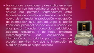 El documento describe el estado de Internet al comienzo del siglo XXI. Señala que el uso de Internet se ha extendido rápidamente, especialmente en América Latina, aunque la mayoría de la población mundial aún no tiene acceso. Las empresas están interesadas en hacer negocios a través de Internet. Sin embargo, persiste una brecha digital significativa entre países y dentro de los países, lo que aumenta las desigualdades sociales.