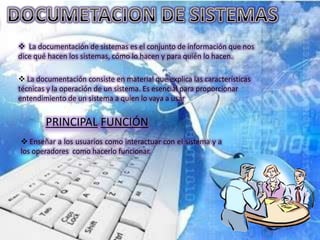 Este documento proporciona información sobre la documentación de sistemas. Explica que la documentación describe qué hacen los sistemas, cómo funcionan y para quién. Incluye diferentes tipos de documentación como la documentación de programas, documentación de usuario y manuales de usuario. Resalta la importancia de documentar sistemas de manera completa para facilitar el mantenimiento y soporte futuros.