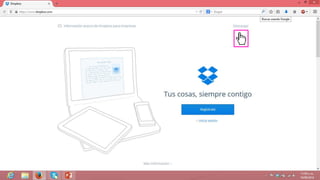 Dropbox es una herramienta que permite sincronizar y almacenar archivos en la nube de forma gratuita. Se puede usar para realizar copias de seguridad, compartir documentos entre dispositivos, y almacenar hasta 2GB de archivos de forma gratuita aunque se pueden ganar más espacios compartiendo Dropbox con amigos. La instalación es sencilla descargando el archivo ejecutable que crea una carpeta Dropbox en el equipo para almacenar y sincronizar archivos de forma automática entre dispositivos.