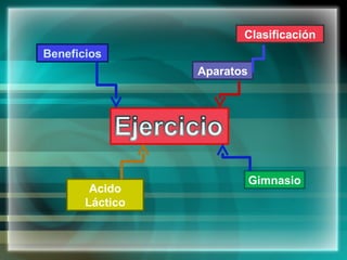 El documento describe los beneficios del ejercicio para la salud física y mental, cómo el ácido láctico se acumula en los músculos durante el ejercicio intenso sin oxígeno suficiente, y que para obtener resultados óptimos del ejercicio en el gimnasio se debe considerar factores como la alimentación, rutinas, tiempo de ejercicio y descanso. También clasifica los aparatos de gimnasio en prensas y poleas.