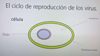 El documento describe el ciclo de replicación de los virus y la patogénesis viral. El ciclo de replicación consta de fijación a la célula, penetración, eclipse y multiplicación. La patogénesis viral se refiere al proceso por el cual los virus causan enfermedad en el huésped e implica interacciones complejas entre el virus y el huésped.