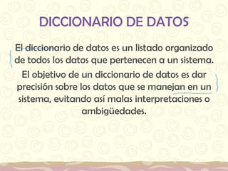 El documento habla sobre los diccionarios de datos. Explica que un diccionario de datos es un listado organizado de todos los datos que pertenecen a un sistema, y que su objetivo es dar precisión sobre los datos que se manejan en el sistema. También define los elementos importantes de un diccionario de datos como flujos de datos, almacenes de datos y procesos, y describe cómo se definen y documentan los datos en un diccionario.