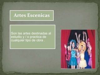 El documento habla sobre las artes escénicas como una forma de expresión artística y lúdica para los niños que les permite desarrollar habilidades a través del juego, la expresión oral y corporal, y la representación de obras teatrales. Las artes escénicas estimulan la creatividad de los niños y les dan confianza para expresarse frente a otros.