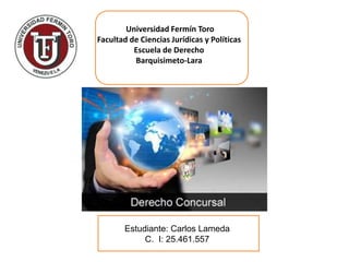 El documento habla sobre el Derecho Concursal. Explica que es la rama del Derecho Mercantil que regula los concursos acreedores. Regula procesos como la suspensión de pagos y la quiebra, buscando preservar la viabilidad económica del deudor y proteger los derechos de los acreedores. Incluye detalles sobre figuras como el síndico, la comisión de acreedores y la sentencia que dictamina sobre la solicitud de atraso.
