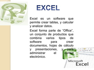 Excel es un software para crear y analizar hojas de cálculo. Forma parte de Microsoft Office, que incluye programas para crear documentos, presentaciones y administrar correo electrónico. Excel permite ingresar y dar formato a datos, así como realizar cálculos y análisis mediante funciones.