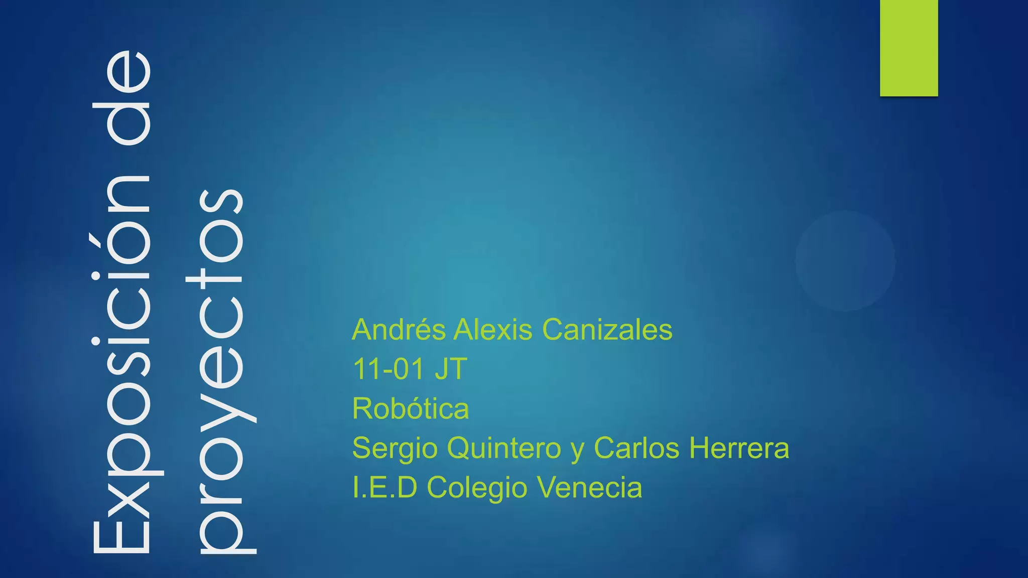 El documento presenta un proyecto de robótica que tiene como objetivo incentivar el desarrollo de nuevas ideas de emprendimiento en el colegio Venecia a través de la creación de un robot seguidor de línea. El proyecto busca demostrar la importancia de la tecnología y beneficiar a los estudiantes mostrando prototipos robóticos para que aprendan y se interesen por esta carrera.