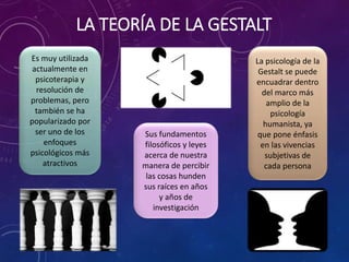 La teoría de la Gestalt se originó en Alemania en 1910 y se centra en cómo las personas perciben formas y patrones. Los principales representantes de esta teoría estudiaron cómo el cerebro tiende a agrupar estímulos visuales de manera holística. La terapia Gestalt se basa en vivir en el momento presente y ayudar a los pacientes a descubrir la función de sus acciones actuales.