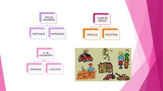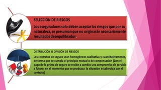 El documento habla sobre las compañías de seguros. Explica que son empresas que ofrecen seguros que cubren riesgos a los que se enfrentan personas y bienes. Describe características como su exclusividad, garantías financieras y personal especializado. También define el contrato de seguro como un acuerdo donde la compañía vende una póliza y se compromete a indemnizar en caso de siniestro a cambio de primas. Finalmente, menciona conceptos como provisiones técnicas, margen de solvencia y diferentes clases y