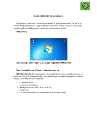 El documento describe los elementos principales del escritorio de Windows, incluyendo el fondo del escritorio, la barra de tareas, los iconos y cómo personalizarlos. Explica que la barra de tareas contiene botones de programas abiertos, opciones de configuración y acceso a aplicaciones. También proporciona instrucciones para crear carpetas, accesos directos y agregar barras de herramientas a la barra de tareas.