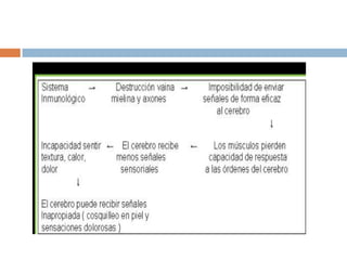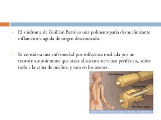 El síndrome de Guillain-Barré es una enfermedad autoinmune rara que ataca el sistema nervioso periférico, causando debilidad muscular y, en algunos casos, parálisis. Los síntomas incluyen debilidad muscular ascendente, alteraciones sensoriales y del sistema nervioso vegetativo. No tiene cura conocida, pero la mayoría de los pacientes se recuperan con el tiempo gracias al tratamiento de soporte como plasmaferesis e inmunoglobulina. La fisioterapia juega un papel importante en la recuperación para prevenir