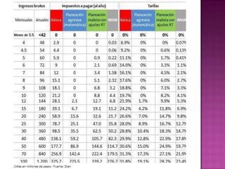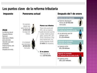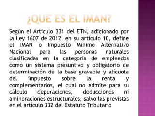 El documento define el Impuesto Mínimo Alternativo Nacional (IMAN) como un sistema presuntivo y obligatorio para determinar la base gravable y alícuota del impuesto sobre la renta para empleados. El IMAN no permite deducciones salvo las previstas en la ley. Aplica a partir de 2013 una tarifa mínima de retención en la fuente para empleados con ingresos superiores a 3,6 millones de pesos. Expertos indican que el IMAN tiende a aplicar mayores tasas impositivas para quienes dependen de su salario.