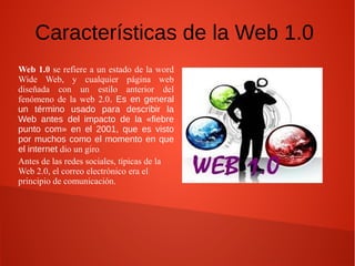 Este documento describe las características de la Web 1.0 y 2.0. Explica que la Web 1.0 consistía en páginas estáticas creadas por desarrolladores y que la Web 2.0 facilita la participación de los usuarios como creadores de contenido a través de blogs, redes sociales y etiquetado colectivo.