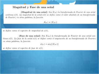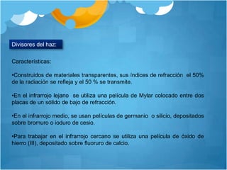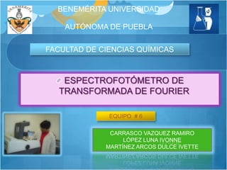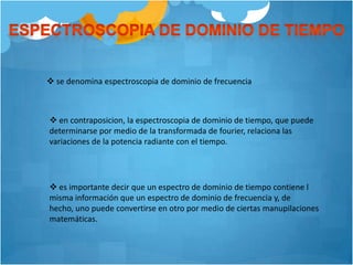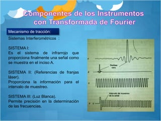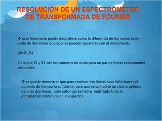 Este documento describe los principios y componentes de la espectroscopia de transformada de Fourier. Explica que la transformada de Fourier relaciona las variaciones de potencia radiante con el tiempo y la frecuencia, y que los interferogramas registrados pueden transformarse en espectros de dominio de frecuencia. También resume las ventajas de los espectrómetros de transformada de Fourier, incluida una mejor relación señal/ruido y mayor precisión en la determinación de frecuencias en comparación con instrumentos dispersivos.