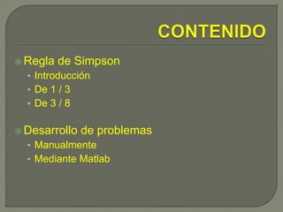 El documento describe el método de Simpson para estimar integrales. La regla de Simpson proporciona una mejor aproximación que la regla del trapecio al ajustar un polinomio de tercer grado en lugar de una línea recta. También presenta un ejemplo de cómo aplicar la regla de Simpson de 1/3 para evaluar una doble integral definida.