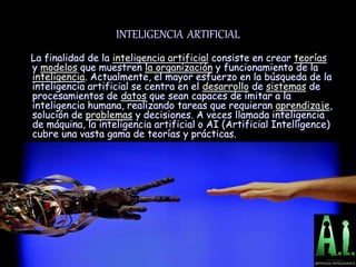 La inteligencia artificial se basa en dos áreas de estudio: el cuerpo humano y el ordenador electrónico. Tiene como finalidad crear teorías y modelos que muestren la organización y funcionamiento de la inteligencia, desarrollando sistemas capaces de imitar la inteligencia humana al realizar tareas que requieran aprendizaje, solución de problemas y toma de decisiones. El robot Asimo desarrollado por Honda Motor Company es uno de los robots humanoides más avanzados, diseñado para ser útil a las personas y ayudar en el