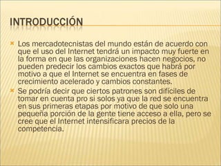 El documento discute tres puntos clave sobre el impacto del Internet en el comercio: 1) Representa una gran conveniencia para que los consumidores comparen productos sin desplazamientos físicos, 2) Reduce los costos de distribución al ser un canal alterno, y 3) Proporciona una nueva forma para que los consumidores obtengan información. Introducir el Internet puede tener tres resultados en los precios y la competencia: aumentarlos si no había búsqueda previa, incrementarlos y ganancias si había búsqueda previa, o incrementarlos, gan
