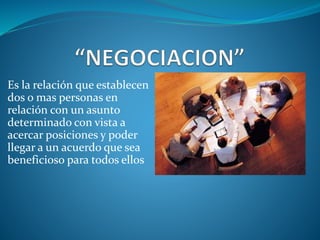 El documento habla sobre la negociación como un proceso mediante el cual dos o más partes con diferencias intentan llegar a un acuerdo beneficioso para todos a través del diálogo y la flexibilidad de posiciones. Explica que la negociación requiere interés de todas las partes en alcanzar un acuerdo y respeto mutuo para lograrlo de manera colaborativa. También brinda consejos sobre estrategias, tácticas, comunicación y características de un buen negociador.