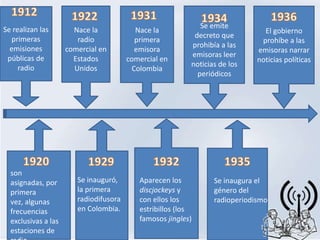 El documento resume la historia de la radio desde sus inicios comerciales en Estados Unidos y Colombia hasta la actualidad. Comenzó con las primeras emisiones públicas y el nacimiento de la radio comercial, luego aparecieron diferentes géneros y emisoras. Más adelante, la radio se enfrentó a la competencia de la televisión pero sigue siendo importante gracias a su capacidad de transmitir noticias de forma rápida e inmediata. Actualmente la radio se transmite también a través de Internet y plataformas digitales.