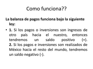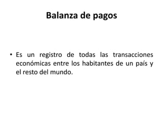 La balanza de pagos es un registro de todas las transacciones económicas entre un país y el resto del mundo. Funciona registrando los pagos e inversiones que un país recibe de otros (saldo positivo) y los que realiza hacia otros países (saldo negativo). Un déficit en la cuenta corriente indica que un país gasta más de lo que produce.