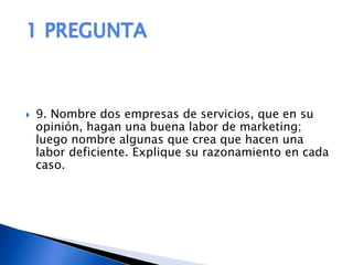 El documento presenta información sobre dos empresas de servicios en Colombia: Bancolombia y Comcel. Detalla la historia, visión, misión y estrategias de mercadeo de cada empresa. También analiza a la Dirección Nacional de Estupefacientes y razones por las que ha tenido dificultades en la lucha contra el consumo de drogas. Finalmente, responde preguntas sobre medidas de mercadeo que una universidad podría implementar ante una disminución en el número de estudiantes.