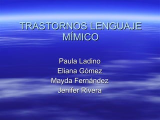 Este documento describe los trastornos del lenguaje mímico. Explica que el lenguaje corporal incluye cualquier movimiento que usamos para comunicarnos y que puede verse afectado por factores orgánicos o psicológicos. Se dividen los trastornos en cuantitativos, que alteran la cantidad de expresiones, e incluyen la hipermimia, hipomimia y amimia, y cualitativos, que cambian la calidad de las expresiones, como la paramimia y ecomimia.