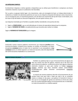 Las máquinas se clasifican según su complejidad, número de pasos necesarios para funcionar, y las tecnologías que integran. Las máquinas simples como la palanca, la polea, el plano inclinado y la rueda permiten multiplicar la fuerza o cambiar su dirección para facilitar el trabajo.