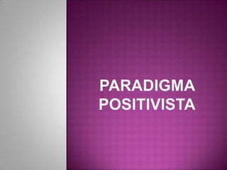 El paradigma positivista busca explicar los fenómenos sociales mediante hechos y leyes objetivas, sin considerar estados subjetivos. Su objetivo es explicar, predecir y controlar fenómenos mediante la verificación de teorías y leyes. Se basa en el método científico para estudiar objetivamente la realidad y establecer relaciones causa-efecto, asumiendo la independencia entre sujeto y objeto de estudio.