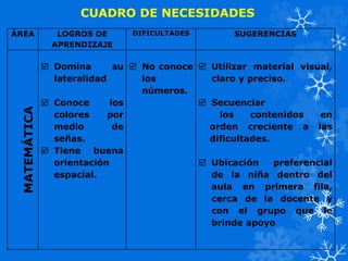 Este documento presenta un resumen del diplomado en detección e intervención en alteraciones del desarrollo infantil. Incluye un cuadro de necesidades de una niña con dificultades en comunicación, matemáticas y ciencias. También propone adaptaciones curriculares y una sesión de clase adaptada sobre animales de la comunidad utilizando el lenguaje de señas.