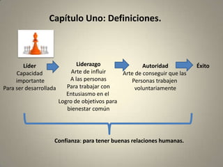 El documento presenta un resumen de cada capítulo del libro "La Paradoja" de James Hunter. Los capítulos discuten definiciones de líder y liderazgo, paradigmas antiguos y nuevos, modelos de liderazgo basados en el servicio y sacrificio, cualidades como el amor, la paciencia y el compromiso, y cómo crear un ambiente de trabajo sano y cordial que conduzca a resultados positivos.