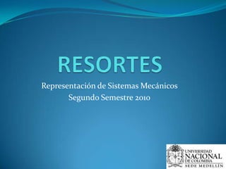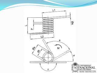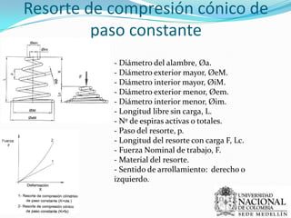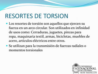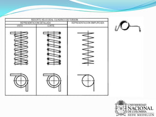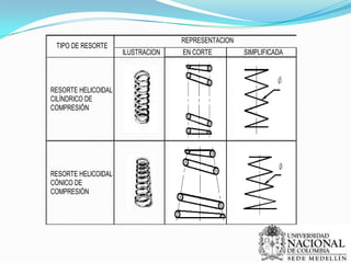 Este documento describe diferentes tipos de resortes, incluyendo resortes helicoidales de compresión y tracción, resortes de torsión, resortes de láminas y resortes de disco. Explica sus características, aplicaciones y cómo representarlos técnicamente.